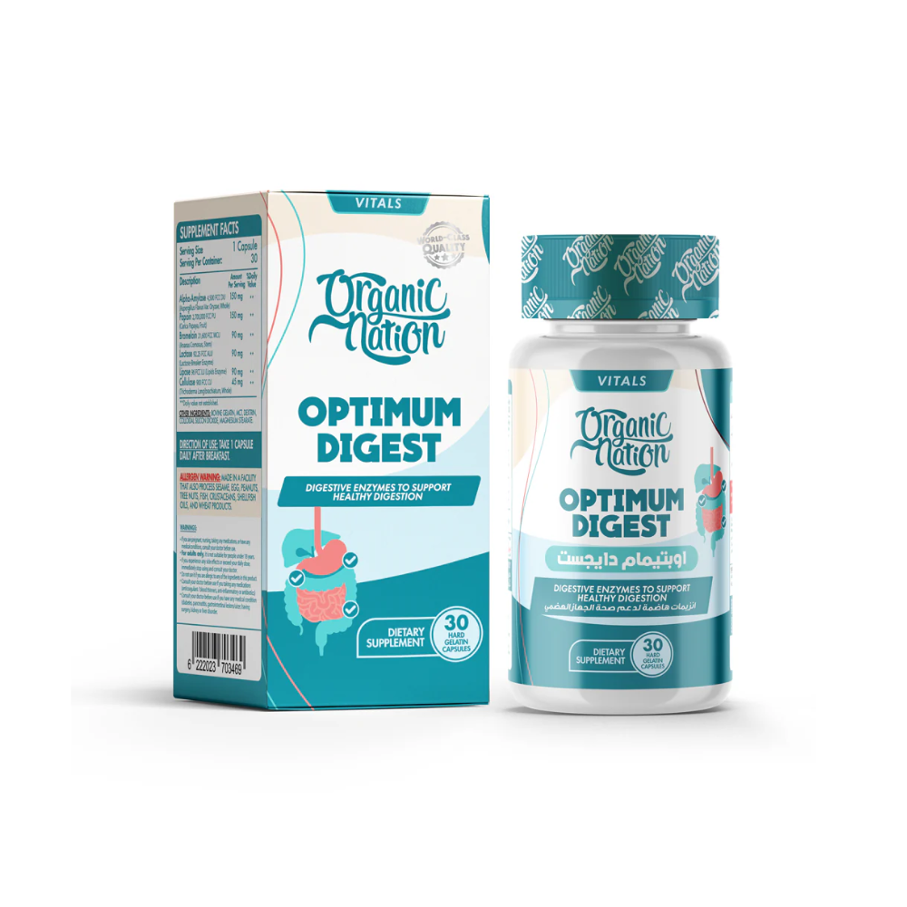أورجانيك نيشن اوبتيمام دايجست 30 كبسولة هو مكمل غذائي مُصمم لدعم صحة الجهاز الهضمي، حيث يحتوي على مكونات تساعد على تحسين عملية الهضم، تقليل الانتفاخ والغازات، وتعزيز امتصاص العناصر الغذائية من الطعام