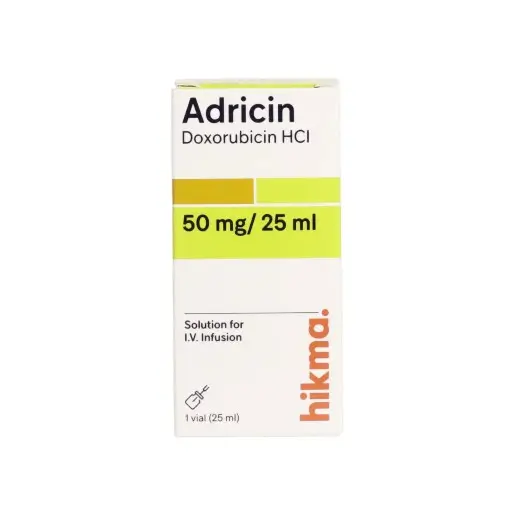 ادريسين (Adricin 50 mg/25 ml) يحتوي على المادة الفعالة دوكسوروبيسين هيدروكلوريد (Doxorubicin HCl)، وهي من فئة الأنثراسيكلين المستخدمة في العلاج الكيميائي، يعمل من خلال تثبيط نمو الخلايا السرطانية ومنعها من الانقسام والتكاثر.