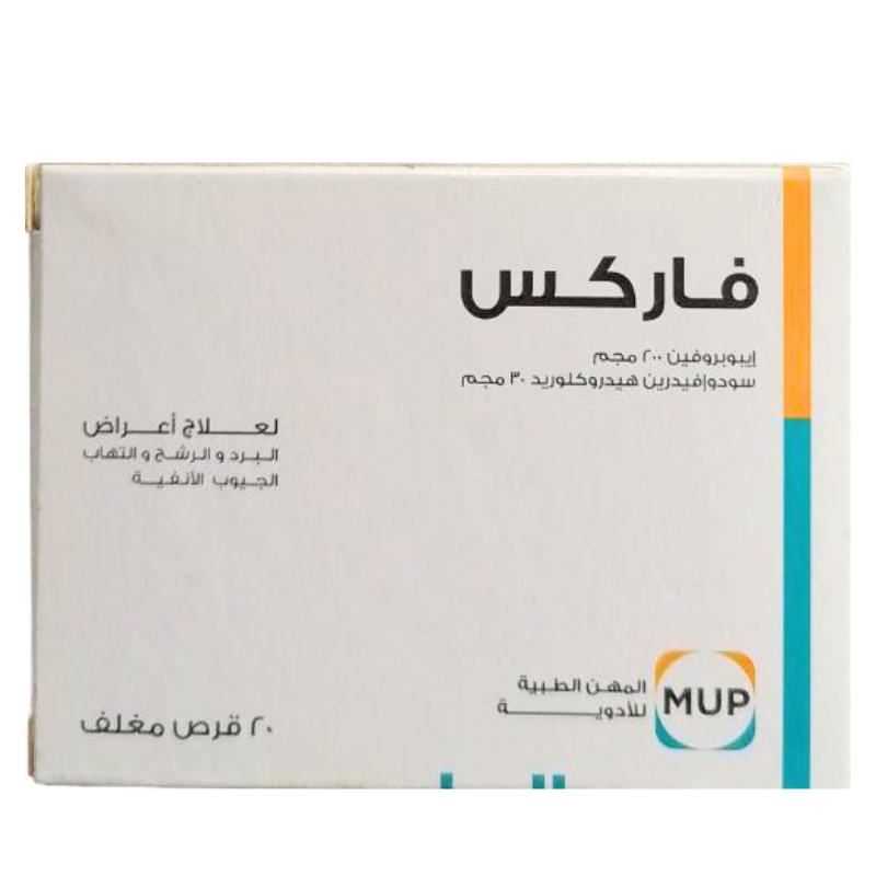 إذا لم يتوفر Farex 20 F.C. Tab، يمكن النظر في بدائل تحتوي على نفس المادة الفعّالة (إيبوبروفين + سودوإيفيدرين) أو أدوية مشابهة لتخفيف أعراض البرد مثل: