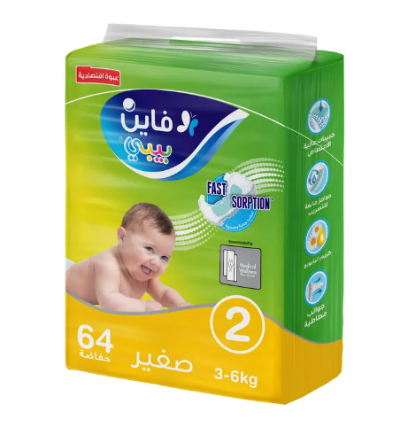 مع حفاضات فاين بيبي مقاس 2 من 3-6 كجم 64 قطعة طفلك دائمًا مرتاح وآمن، فاين بيبي حفاضات عملية توفر امتصاص عالي يمنع البلل لساعات طويلة، نعومة تدوم لحماية بشرة طفلك الحساسة، تصميم مرن يسمح حرية الحركة وراحة مثالية أثناء النوم واللعب.