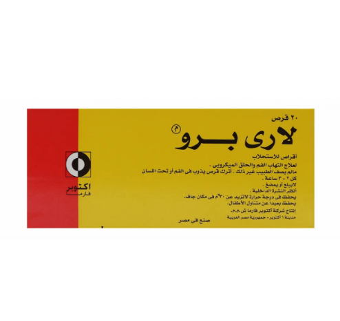 لارى برو استحلاب (Lary Pro Lozenges) هو دواء يُستخدم لتخفيف الأعراض المرتبطة بالتهاب الحلق مثل الألم، الجفاف، والتهيج. يتميز هذا الدواء بتركيبته التي تساعد على تهدئة الحلق وتخفيف الأعراض الناتجة عن الالتهابات الفموية والبلعومية.