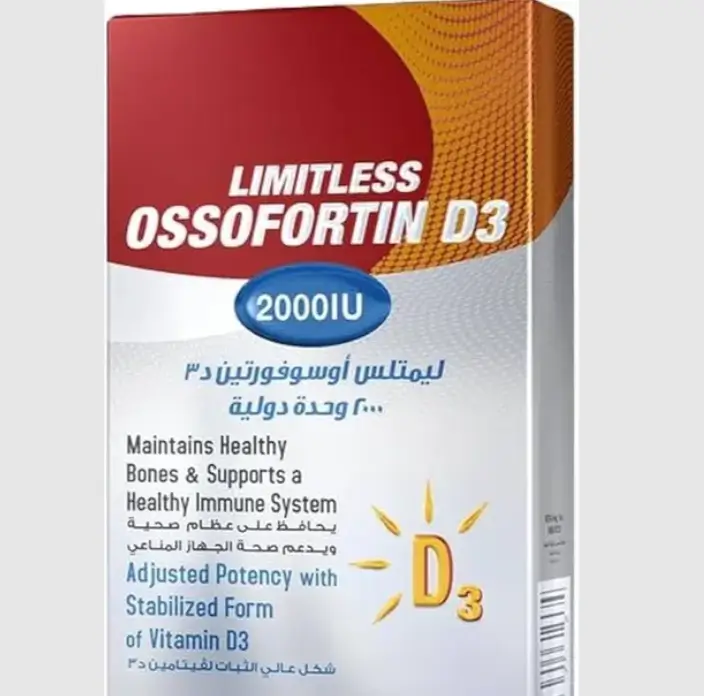 ليمتلس اوسوفورتين د3 مكمل غذائي يحتوي على فيتامين D3، يساعد على امتصاص الكالسيوم والفوسفور لتعزيز صحة العظام والأسنان، يدعم الجهاز المناعي، ويساعد في الوقاية من هشاشة العظام خاصة لكبار السن والنساء بعد سن اليأس.