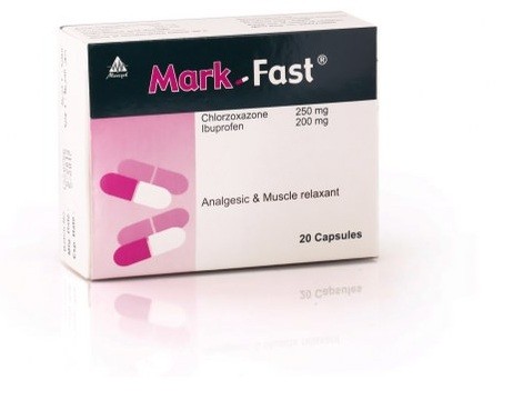 مارك فاست (Mark Fast) هو دواء يجمع بين كلورزوكسازون، الباسط للعضلات المتشنجة، والايبوبروفين، مضاد الالتهاب اللاستيرويدي، لتسكين الألم والحد من الالتهابات والحمى. يستخدم لعلاج آلام العضلات والمفاصل، آلام أسفل الظهر، آلام الرقبة، وآلام الأكتاف الناتجة عن شد أو تشنج العضلات.